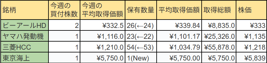 また、今週は三菱HCキャピタル(8593)への買付もしました。高配当株として有名な銘柄で27期連続での増配予定です。現状の配当利回りとしては少し物足りないですが、将来への投資という意味では何の問題もないので、まずは100株目指してコツコツ積み上げていこうと思います。